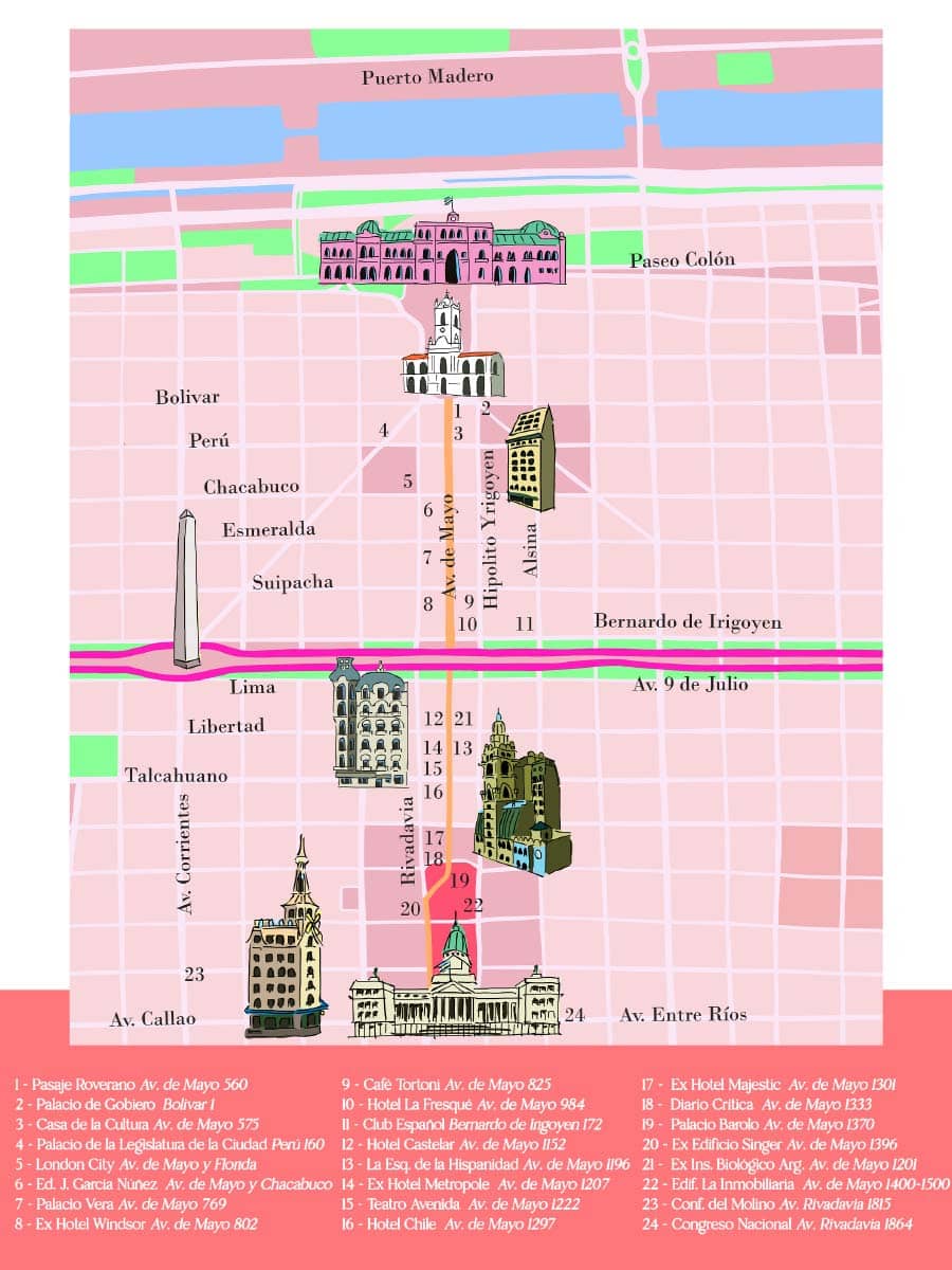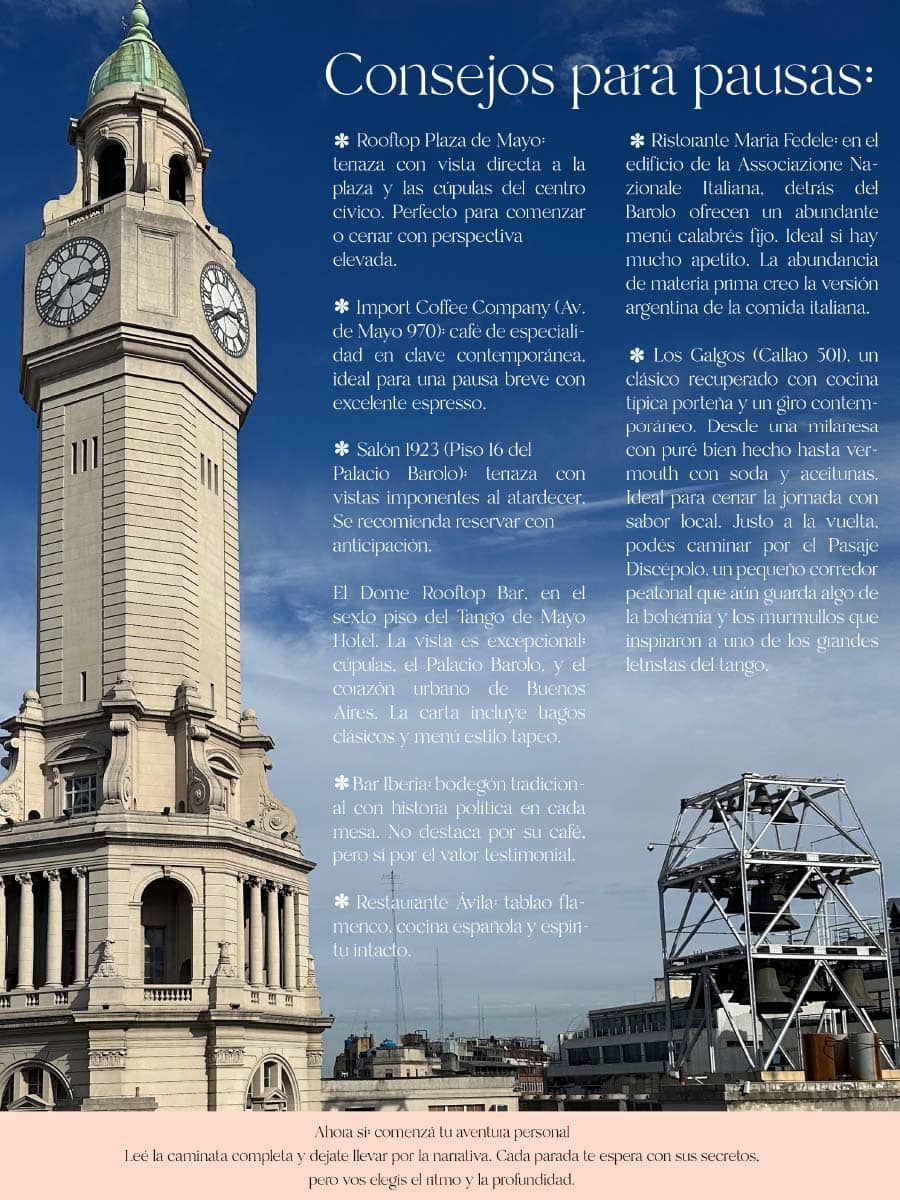 En más de 95 páginas: decodificá el mármol Beaux-Arts financiado por fortunas agrícolas, deslizate por pasajes de los años 20 y leé cómo la inmigración moldeó los sabores. Las rutas incluyen la arqueología política de Plaza de Mayo; un San Telmo que intentó borrar su pasado colonial; Retiro con estaciones Belle Époque y Art Déco oculto; Recoleta entre fachadas y fantasmas aristocráticos; un capítulo sobre cómo humedales devinieron real state de lujo; y una ciclovía por Libertador que enlaza pueblos desaparecidos con monumentos modernistas.